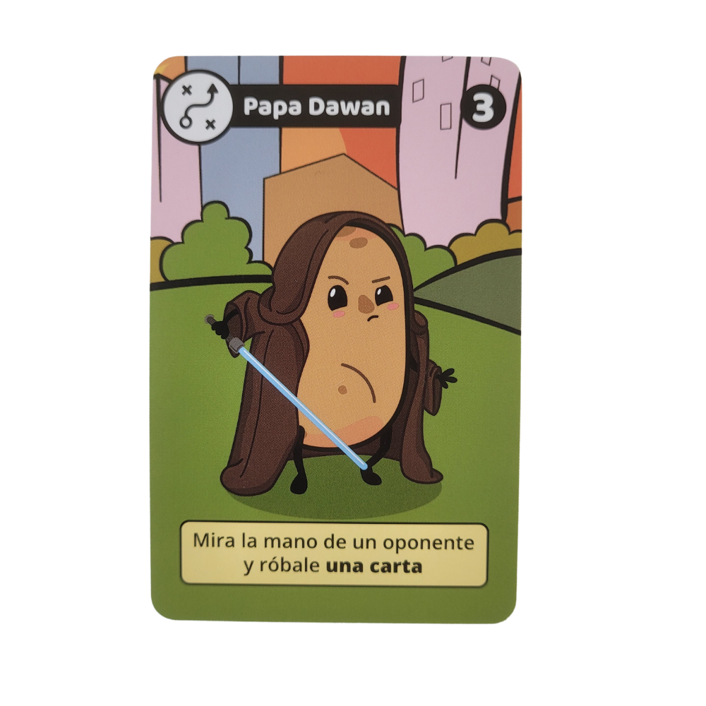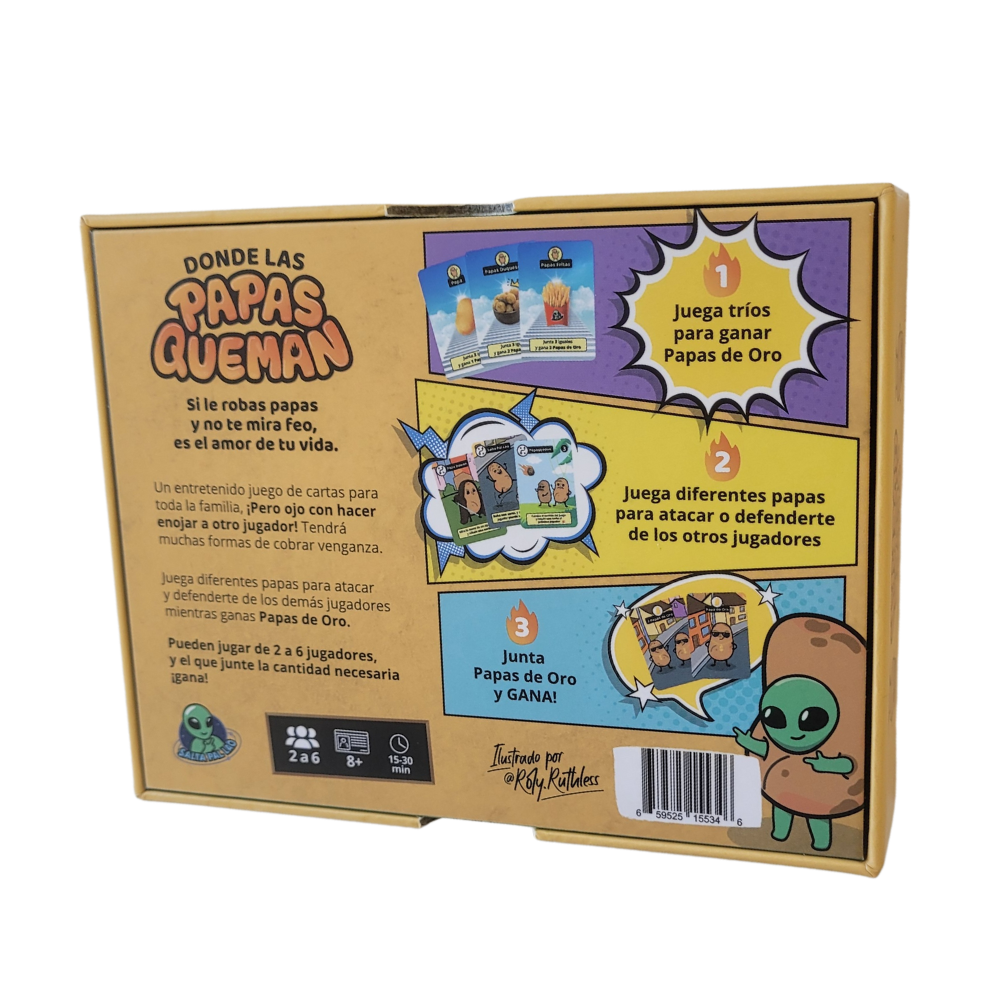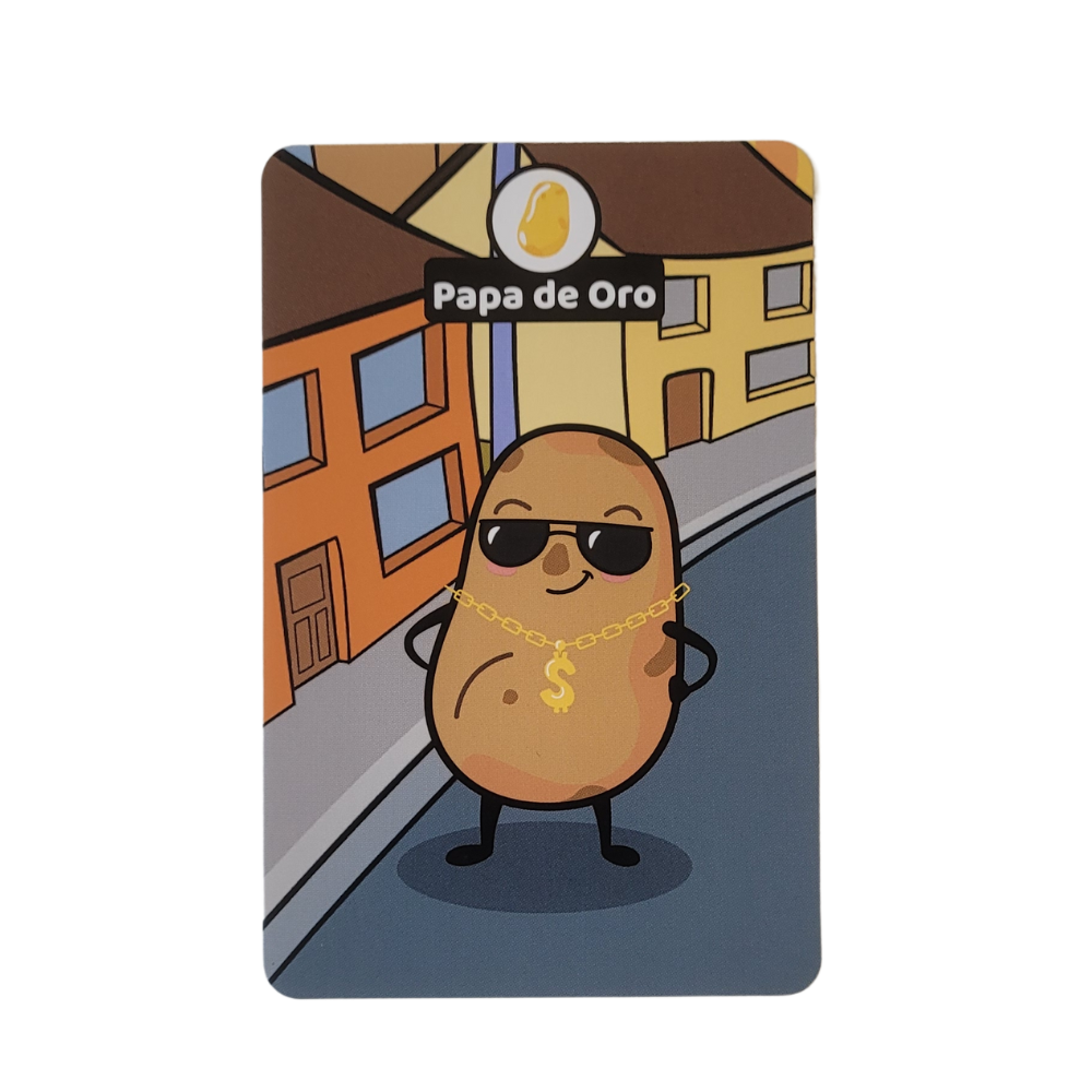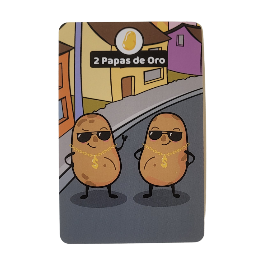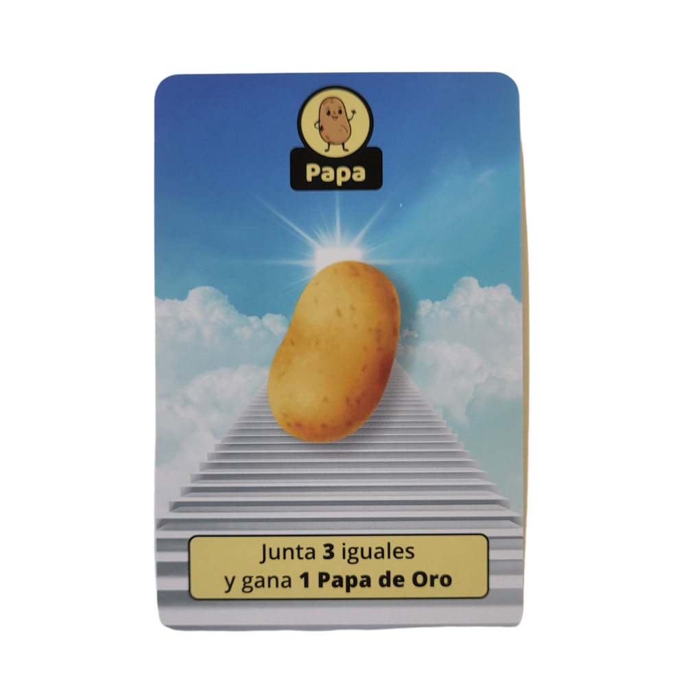 Un entretenido juego de cartas para toda la familia. ¡Pero ojo con hacer enojar a otro jugador! Tendrá muchas formas de cobrar venganza. Juega diferentes papas para atacar y defenderte de los demás jugadores mientras ganas Papas de Oro. Pueden jugar de 2 a 6 jugadores, y el que junte la cantidad necesaria ¡Gana! El juego contiene: