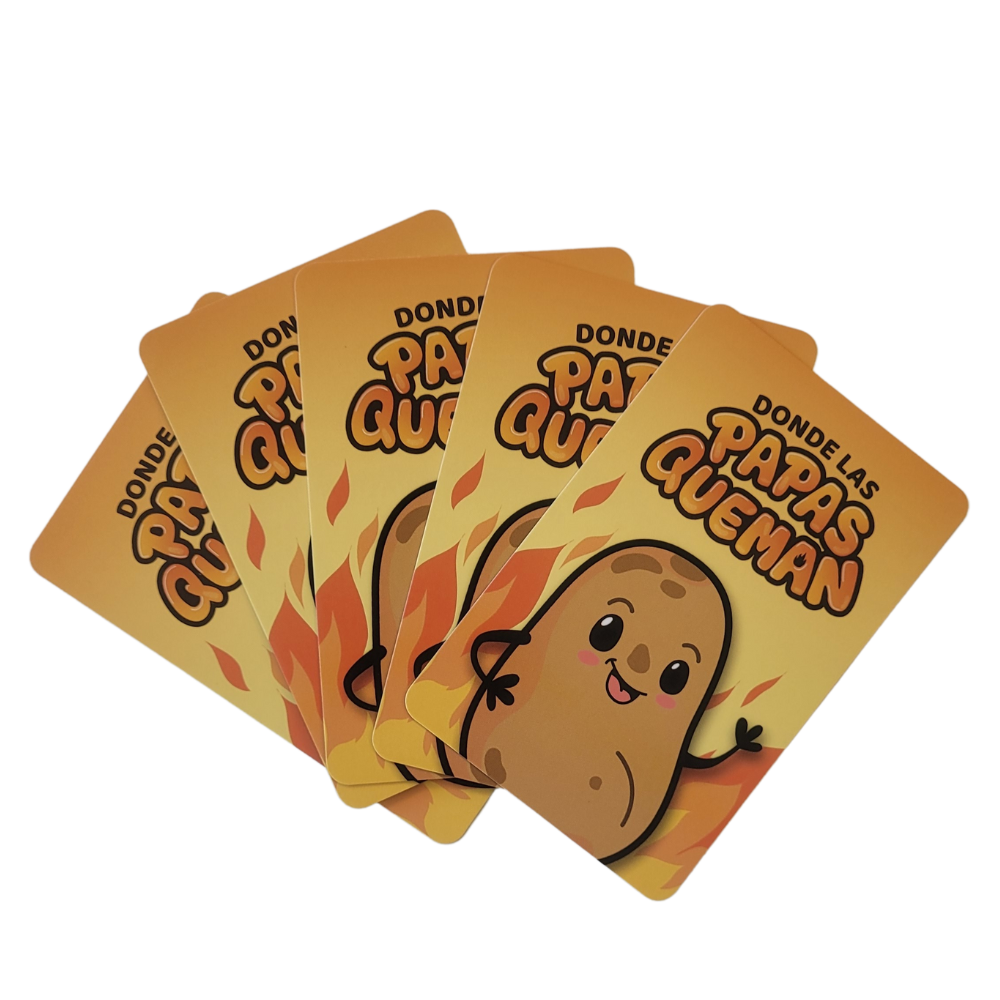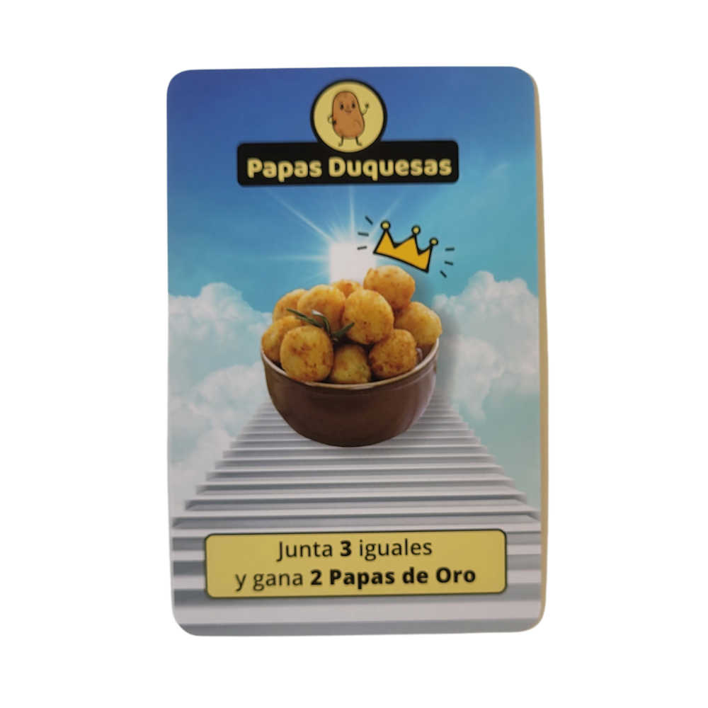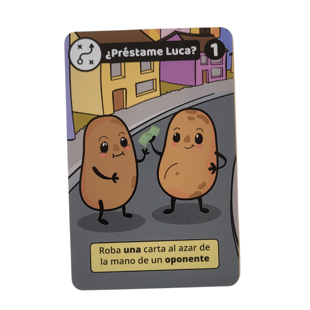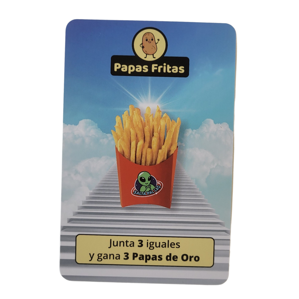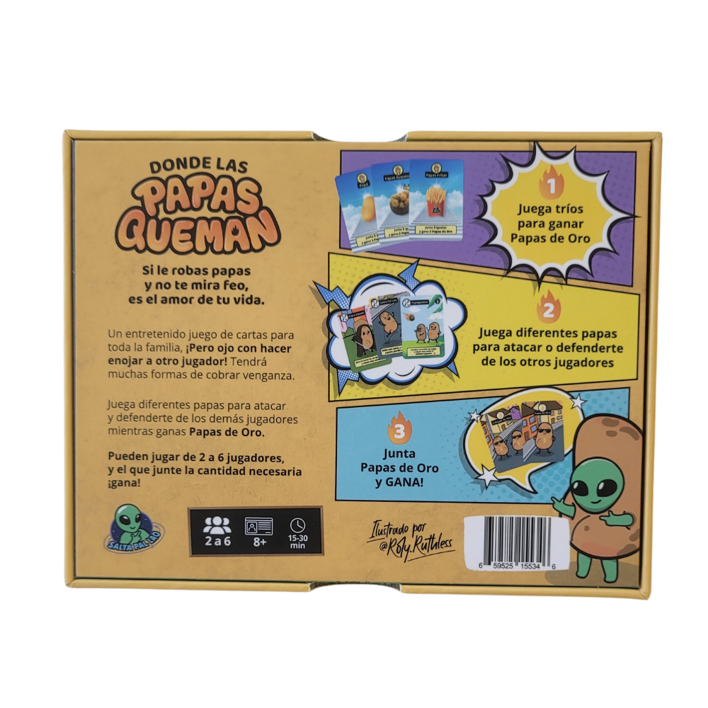 Un entretenido juego de cartas para toda la familia. ¡Pero ojo con hacer enojar a otro jugador! Tendrá muchas formas de cobrar venganza. Juega diferentes papas para atacar y defenderte de los demás jugadores mientras ganas Papas de Oro. Pueden jugar de 2 a 6 jugadores, y el que junte la cantidad necesaria ¡Gana! El juego contiene: