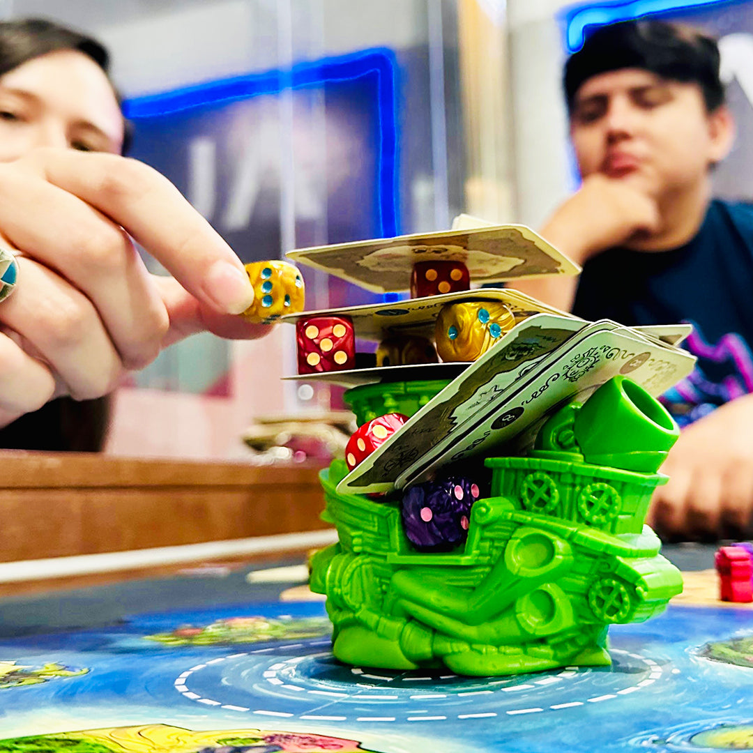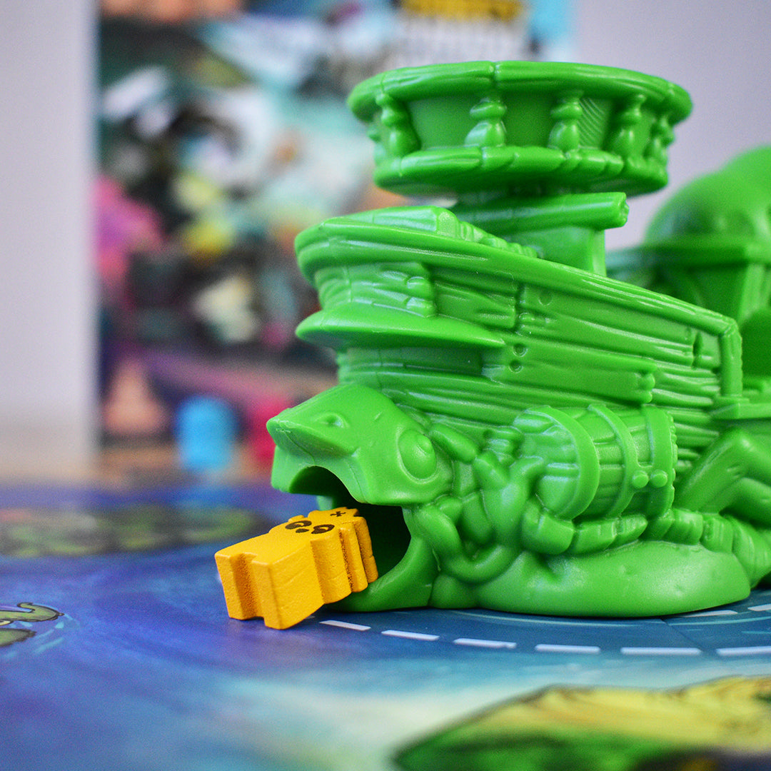 Desliza tu panda pirata desde la figura de barco-tortuga en el centro del tablero para aterrizar en una isla y activar un minijuego. Ganarás monedas y beneficios cuanto mejor juegues los minijuegos que varían en mecánicas: destreza, memoria, suerte, movimiento táctico, entre otros. Al final de la ronda, muévete en el tablero de Búsqueda del Tesoro y encuentra los cofres o cómpralos con tus monedas.